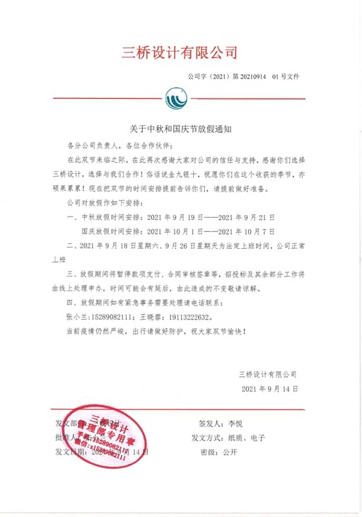 在此双节来临之际,在此再次感谢大家对公司的信任与支持,感谢你们选择三桥设计,选择与我们合作!俗话说金九银十,祝愿你们在这个收获的季节,亦硕果累累!现在把双节的时间安排提前告诉你们,请提前做好准备。