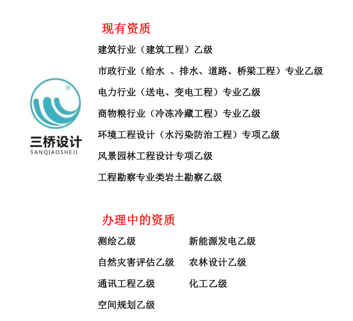 三桥自成立以来已经拥有了一批优良的资质,其中包括:建筑行业(建筑工程)乙级,市政行业(给水、排水、道路、桥梁工程)专业乙级,电力行业(送电、变电工程)专业乙级,商物粮行业(冷冻冷藏工程)专业乙级,环境工程设计(水污染防治工程)专项乙级,风景园林工程设计专项乙级也拥有了一批优质的客户。现在的岩土勘察资质也进入了公示期,在公示结束以后就能供大家使用啦。第三批:测绘乙级,新能源发电乙级,自然灾害评估乙级,农林设计乙级,通讯工程乙级,化工乙级,空间规划乙级也正在筹备中。与此同时,项目承接范围也将进一步扩大,也更有利与大家的业务开展。